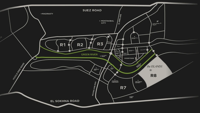 - يقع كمبوند ذا ايلاند العاصمة الإدارية بالقرب من النهر الأخضر والحديقة المركزية حتى يتمتع السكان باستنشاق الهواء المنعش.
